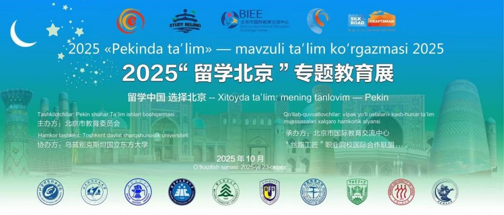 23 октября 2025 года в Ташкенте успешно прошла выставка «Учёба в Пекине – 2025», организованная Пекинским комитетом по делам образования и Пекинским центром международного образовательного обмена совместно с Ташкентским государственным университетом востоковедения. В мероприятии приняла участие пекинская делегация из 9 ведущих университетов, включая Пекинский университет авиации и космонавтики, Центральный финансово-экономический университет и Китайский сельскохозяйственный университет.